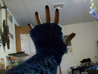 They're arm warmers. I actually really like making them. I sometimes put them on Etsy, somebody bought a pair of purple ones once and I was super excited! I have these blue ones, and I'm making a pair of red/orange ones too.